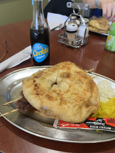 Cevapi: Juicy, garlic-infused beef sausages served in lepinja with onions and a dollop of creamy sour cream.